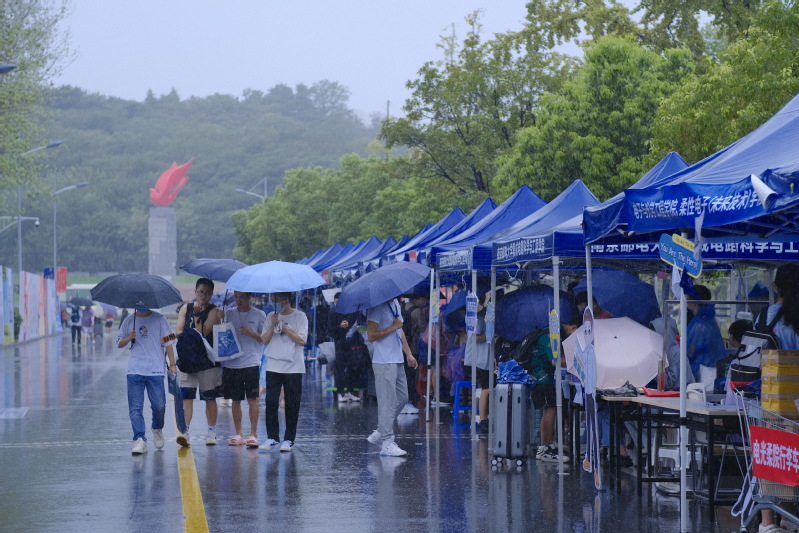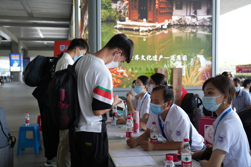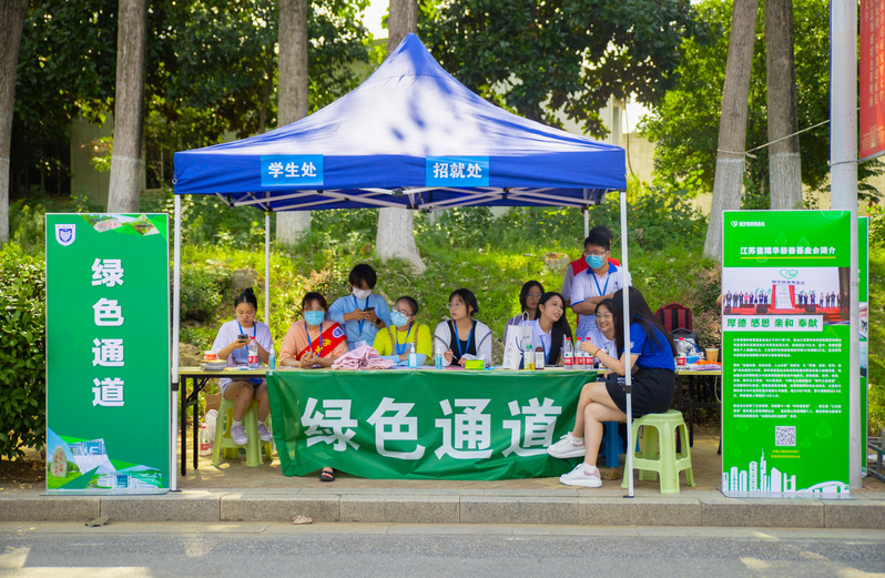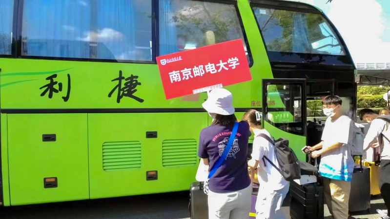 出站就是南郵,為迎接2022級新生的到來,學(xué)校在南京站、南京南站設(shè)立迎新服務(wù)點(diǎn),安排大巴接站,教師志愿者們?yōu)橥獾貋韺幮律峁└黝愋畔⒆稍兎?wù),為新生一路來校報(bào)到“保駕護(hù)航”。校門口,學(xué)校設(shè)置多條進(jìn)校通道迎接新生入校;校門外,在師生志愿者和安保人員的悉心引導(dǎo)下,同學(xué)們有序進(jìn)行刷臉核驗(yàn),查驗(yàn)蘇康碼、行程碼、48小時(shí)內(nèi)核酸檢測陰性證明,體溫檢測后進(jìn)入校園。