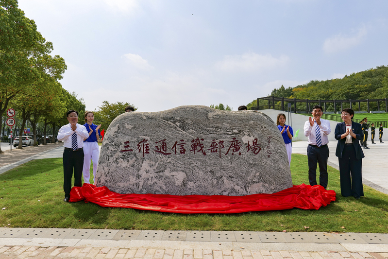 三維通信股份有限公司董事長李越倫、校黨委書記劉陳、校長葉美蘭共同為三維通信戰(zhàn)郵廣場揭幕