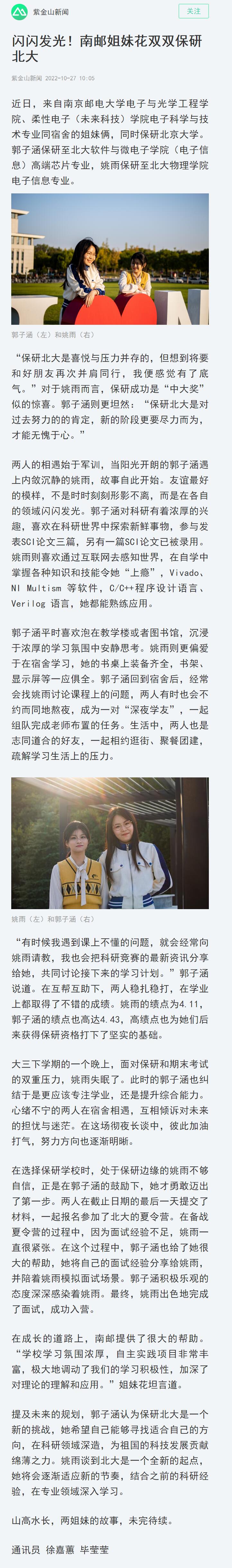 【南京日報客戶端】閃閃發光!南郵姐妹花雙雙保研北大