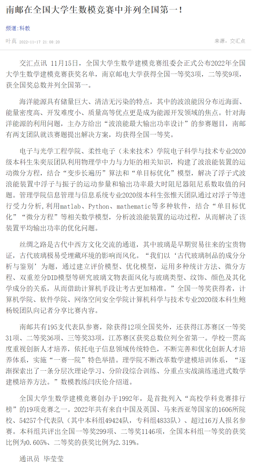 【新華日報客戶端】南郵在全國大學生數模競賽中并列全國第一!
