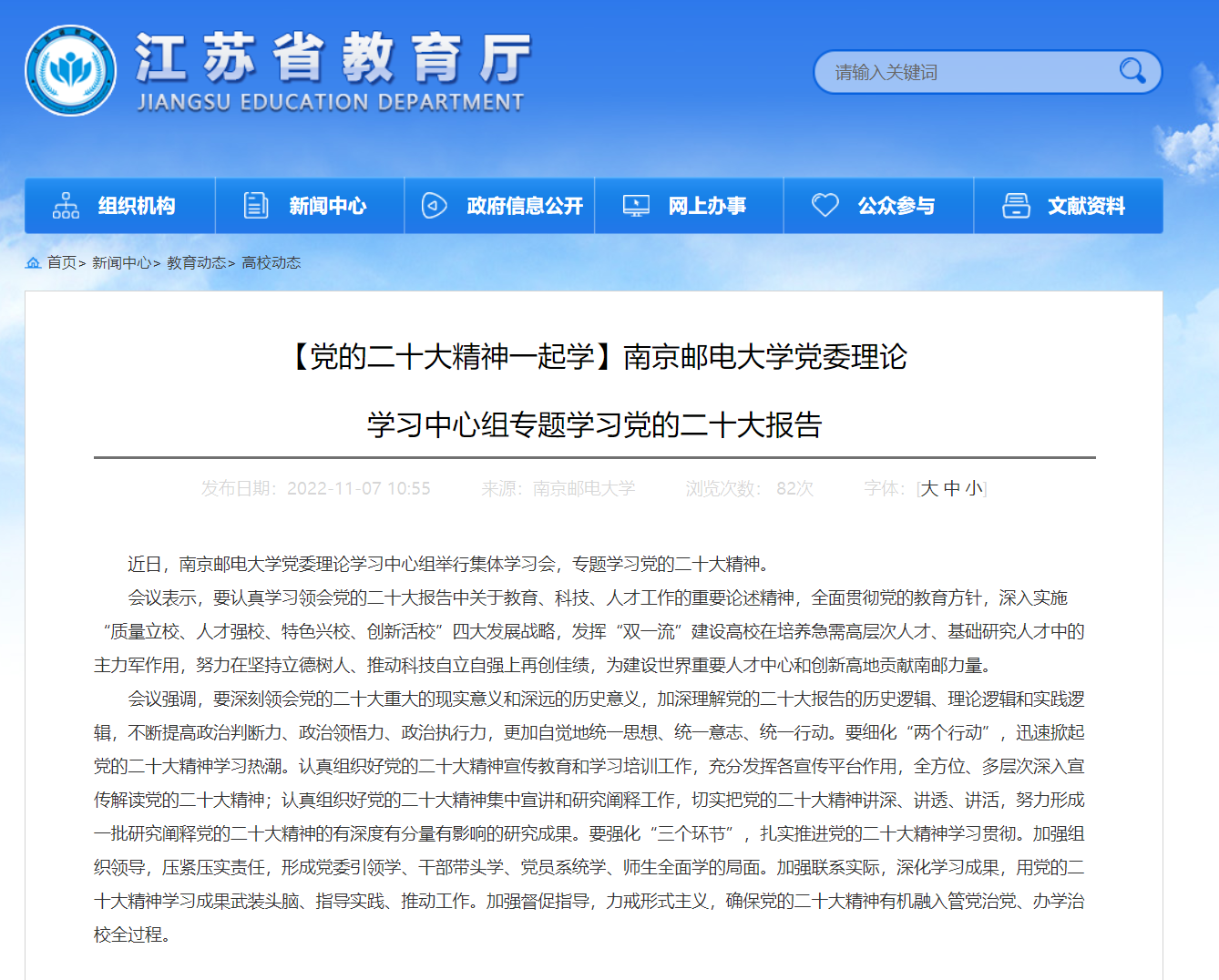 【省教育廳官網】南京郵電大學黨委理論學習中心組專題學習黨的二十大報告