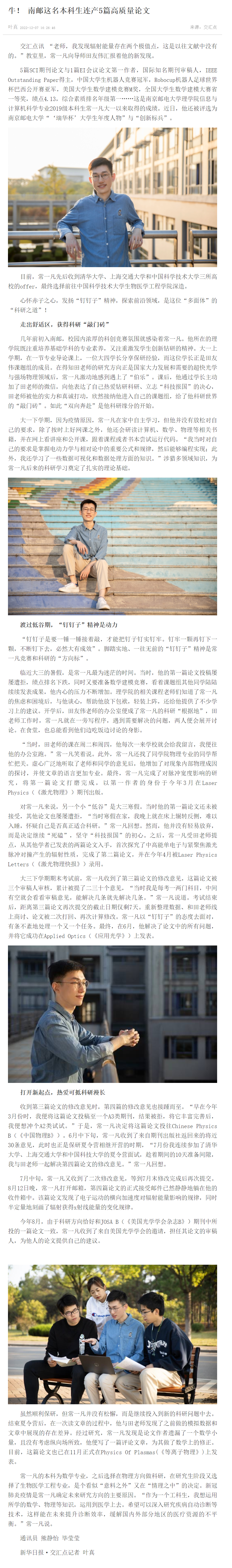 【新華日報客戶端】牛! 南郵這名本科生連產5篇高質量論文