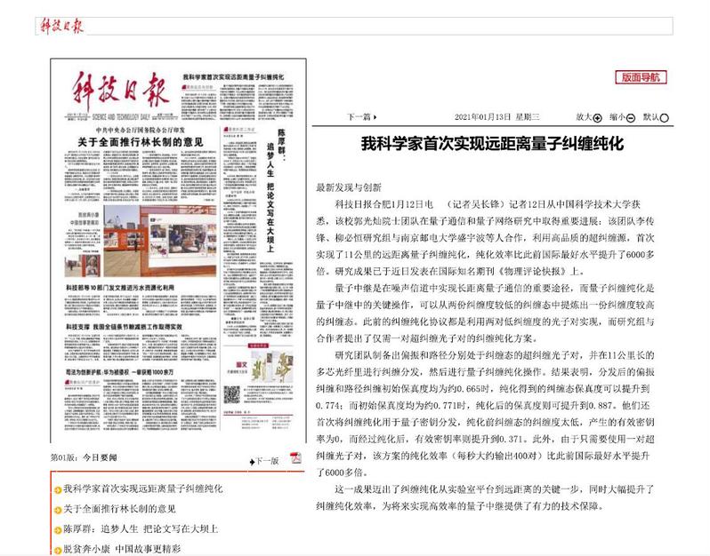 此前,該成果還被《人民日?qǐng)?bào)》、《科技日?qǐng)?bào)》頭版、以及央視新聞等以“我科學(xué)家實(shí)現(xiàn)11公里遠(yuǎn)距離量子糾纏純化”為題廣泛報(bào)道。