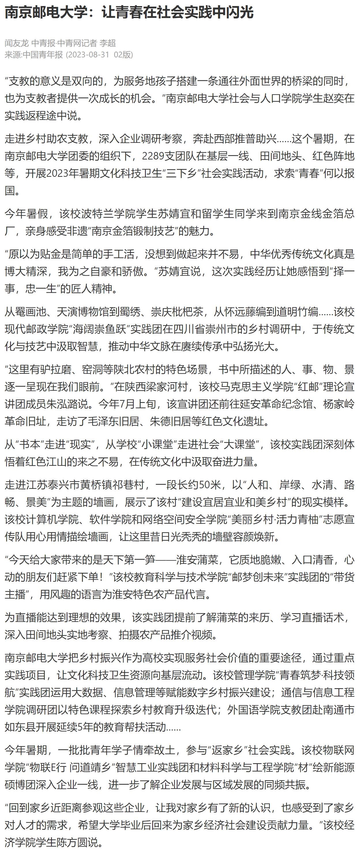 【中國青年報】南京郵電大學:讓青春在社會實踐中閃光
