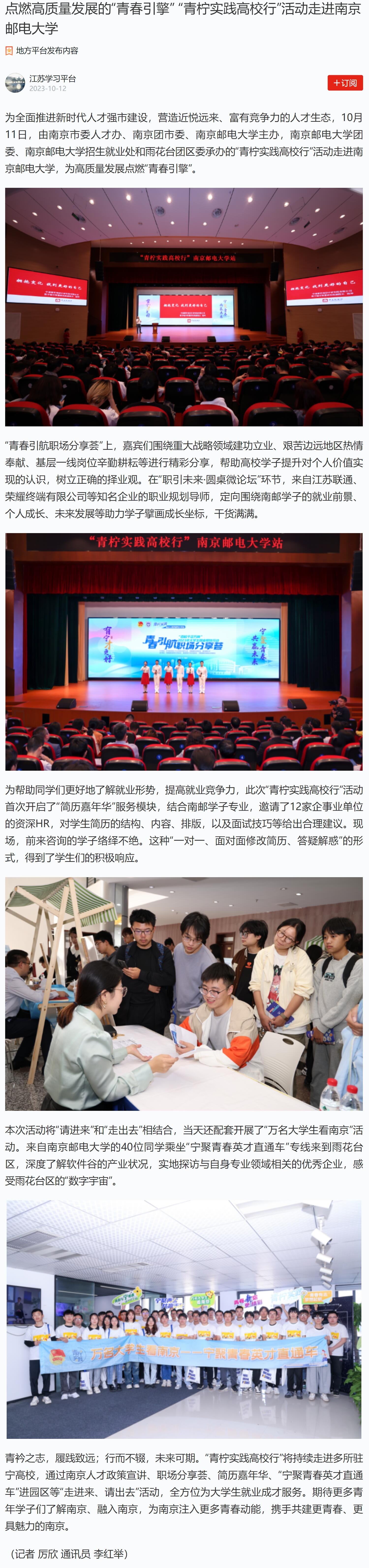 【學習強國】點燃高質量發展的“青春引擎” “青檸實踐高校行”活動走進南京郵電大學