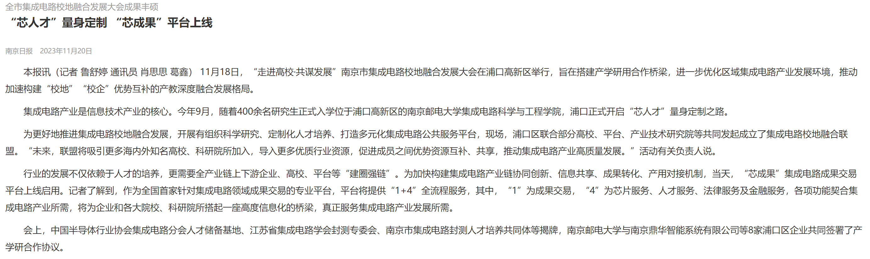 【南京日報】“芯人才”量身定制 “芯成果”平臺上線