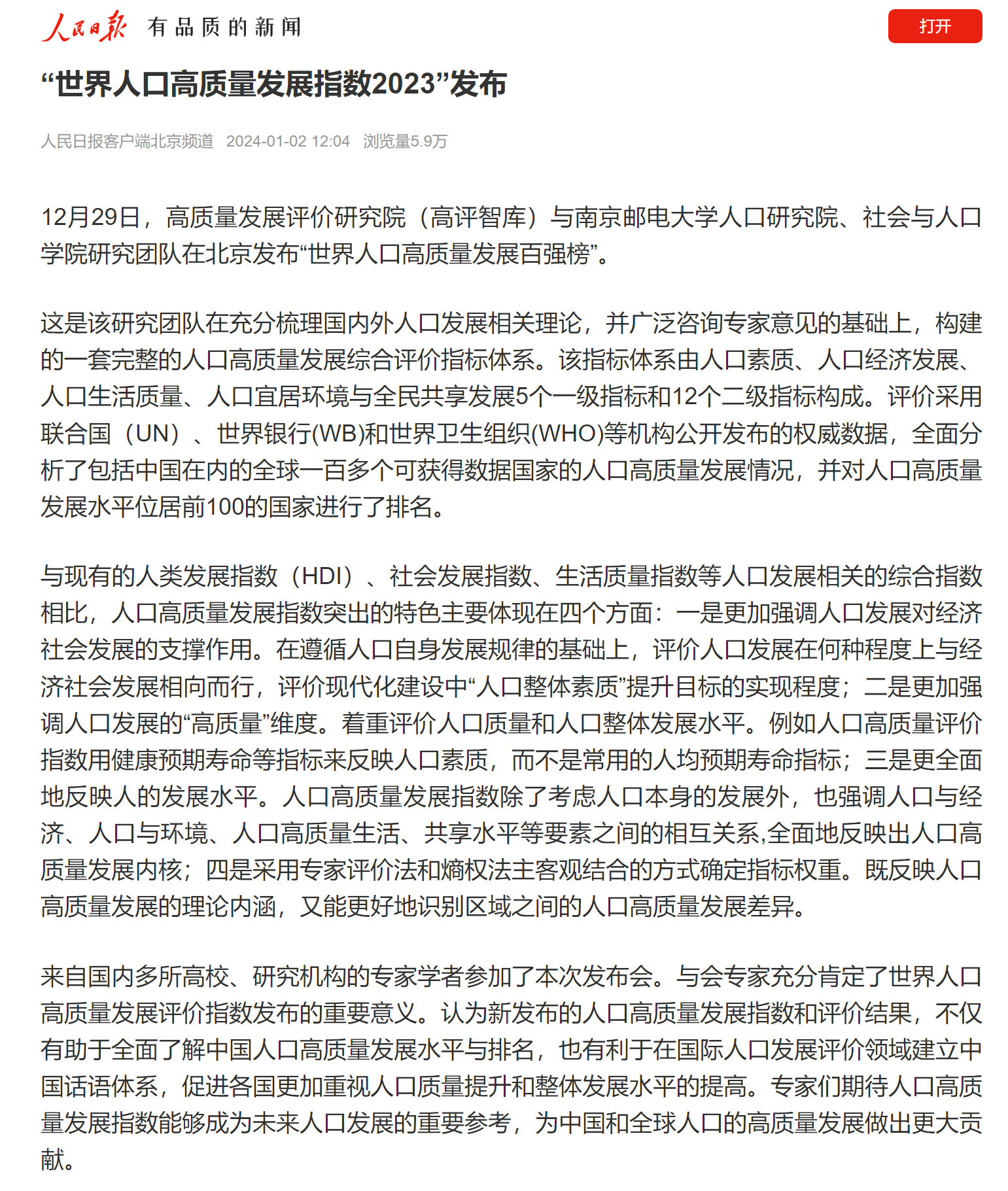 【人民日報客戶端】“世界人口高質量發展指數2023”發布