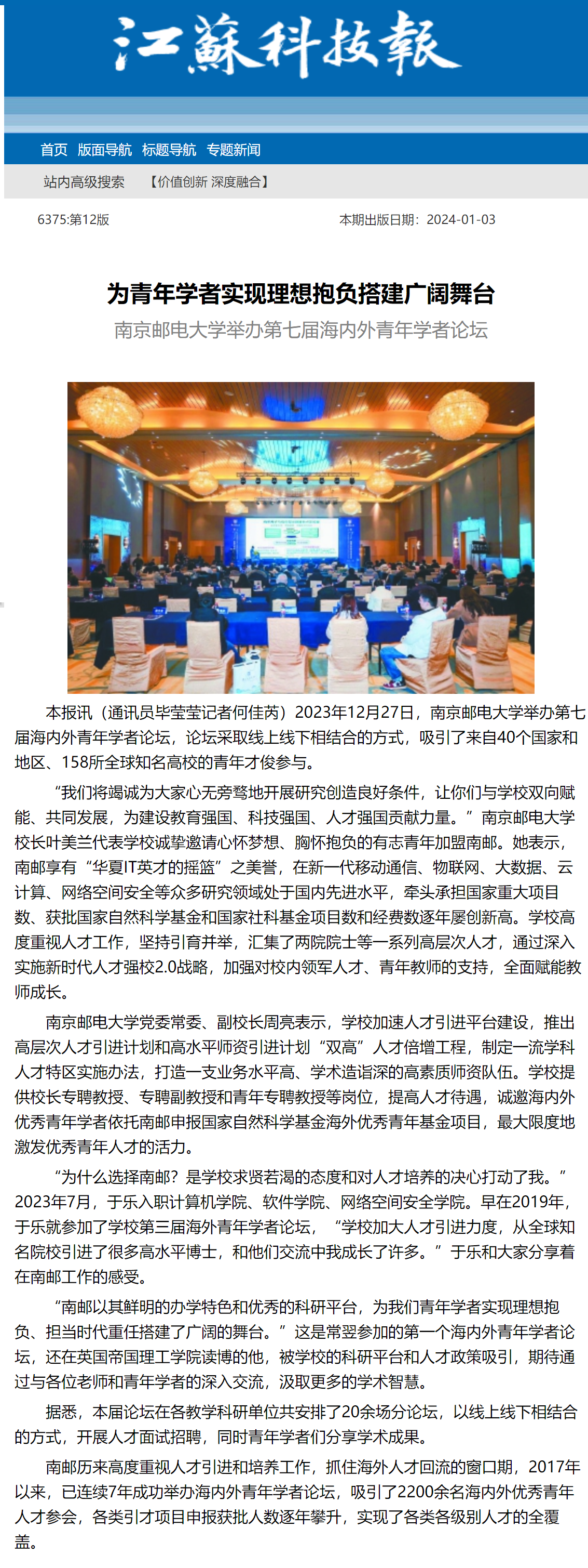【江蘇科技報】為青年學者實現理想抱負搭建廣闊舞臺南京郵電大學舉辦第七屆海內外青年學者論壇