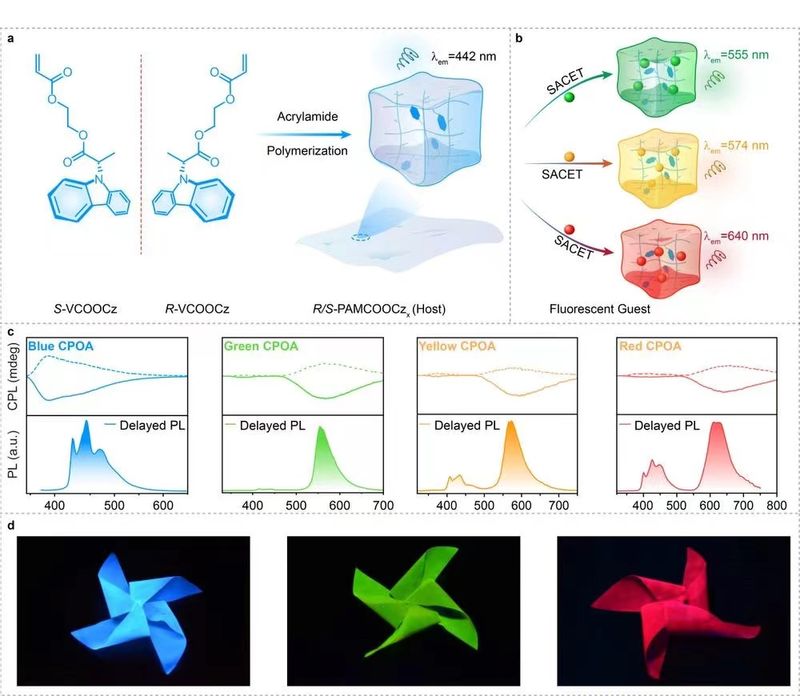 近日,南京郵電大學有機電子與信息顯示國家重點實驗室黃維院士團隊陶冶和陳潤鋒教授在手性有機長余輝領域取得新進展,提出了一種通過共價自限域手性發色團來獲得藍色手性長余輝的簡單方法,設計出具有超長壽命、高發光不對稱因子的藍色手性有機長余輝聚合物。將藍色手性余輝聚合物作為主體與熒光客體共混,利用余輝和手性協同能量傳遞策略,成功地實現了全彩手性余輝發射體系的構建,并探索了該類材料在信息加密、立體顯示等領域的應用。