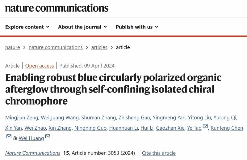 4月9日,相關成果以“Enabling robust blue circularly polarized organic afterglow through self-confining isolated chiral chromophore”為題發表在Nature Communications(《自然?通訊》)上。材料科學與工程學院陶冶教授、陳潤鋒教授和黃維院士為共同通訊作者,碩士生曾明鑒為論文第一作者,本科生王偉光為論文第二作者,南京大學王樂勇教授在圓二色光譜測試方面給予了大力支持。