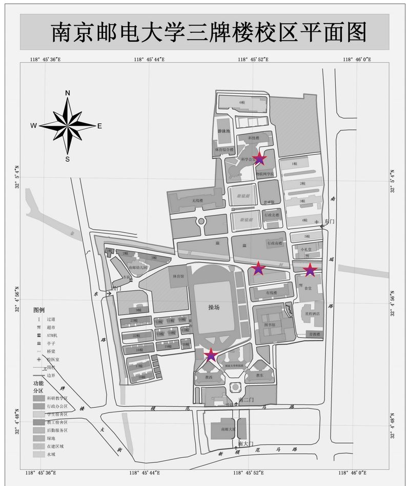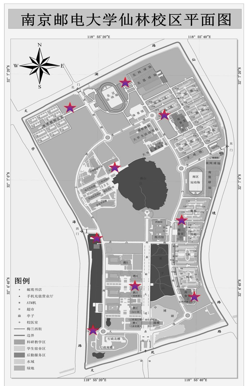 仙林校區:9處,從北至南分別是青教三期、體育場東看臺東側、三食堂北側、文科樓南側、二食堂北側、西門水電中心、教三北側、一食堂東側、行政樓停車場