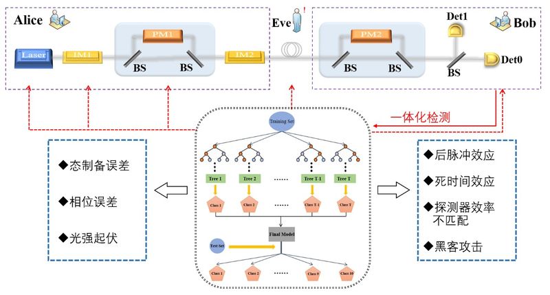 近期,我校通信與信息工程學院量子信息技術研究所的王琴教授團隊在人工智能賦能量子保密通信系統方向取得重要研究進展。該團隊創新性地提出一種基于機器學習輔助的QKD系統缺陷故障和黑客攻擊的檢測方法,實現了對QKD系統缺陷故障和黑客攻擊的一體化實時檢測,并且準確率高達98%。當判斷出QKD 系統中器件存在的缺陷故障或黑客攻擊之后,該方法還能夠主動反饋出存在缺陷故障的器件位置、誤差大小,以及黑客攻擊概率等具體指標,從而指導合法用戶有效防范系統的器件故障和竊聽者的攻擊,進而保障QKD系統的現實安全性。該工作近期發表在國際知名學術期刊SCIENCE CHINA Information Sciences上,該期刊最新影響因子7.3,JCR Q1區,是中國自動化學會(CAA)推薦A+類期刊,中國計算機學會(CCF)、中國通信學會(CIC)推薦A類期刊。該論文的第一作者為通信與信息工程學院二年級博士生徐佳歆,通信作者為通信與信息工程學院量子信息技術研究所的王琴教授、周星宇老師和河南省量子信息與量子密碼重點實驗室的李宏偉教授。