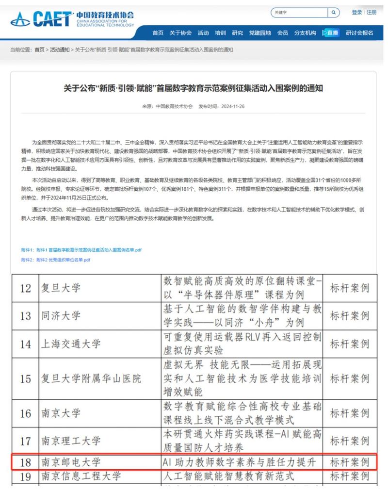 11月26日,由中國教育技術協會組織開展的“‘新質·引領·賦能’首屆數字教育示范案例征集活動”入圍案例名單正式公布,南郵申報的《AI助力教師數字素養與勝任力提升》入圍標桿案例。
