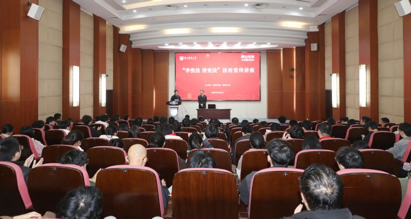 12月6日,我校在仙林校區中天科技報告廳召開普法講座,南京市中級人民法院行政審判庭副庭長周磊應邀出席并主講。活動由黨委宣傳部、法制辦公室主辦,近百名師生代表參加講座。周磊副庭長以“弘揚憲法精神 筑牢法治意識”為題,從憲法的廬山真面、生活中的憲法“關鍵詞”、做憲法的自覺遵守者三個方面展開普法教育。他向師生介紹了憲法的發展史、憲法的特征、憲法的基本原則,并結合真實典型案例,提出要樹立憲法至上的觀念,認真學習憲法知識,養成憲法思維,在具體的生活場景中用憲法來維護國家利益、公共利益和公民權利。