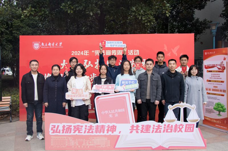 12月3日,由校黨委宣傳部、法制辦公室聯合主辦,電子與光學工程學院、柔性電子(未來技術)學院承辦的“國家憲法日”主題活動在仙林校區南二食堂外場舉行。活動現場,工作人員通過播放憲法宣傳視頻,展示與講解憲法宣傳展板,發放憲法宣傳手冊和普法書籍,提供公益法律咨詢服務,開展“12.4憲法知識競答”“憲法大轉盤”游戲、“我與憲法合照”等方式,向過往師生普及憲法知識,為我校師生帶來一場互動式、零距離的普法新體驗。