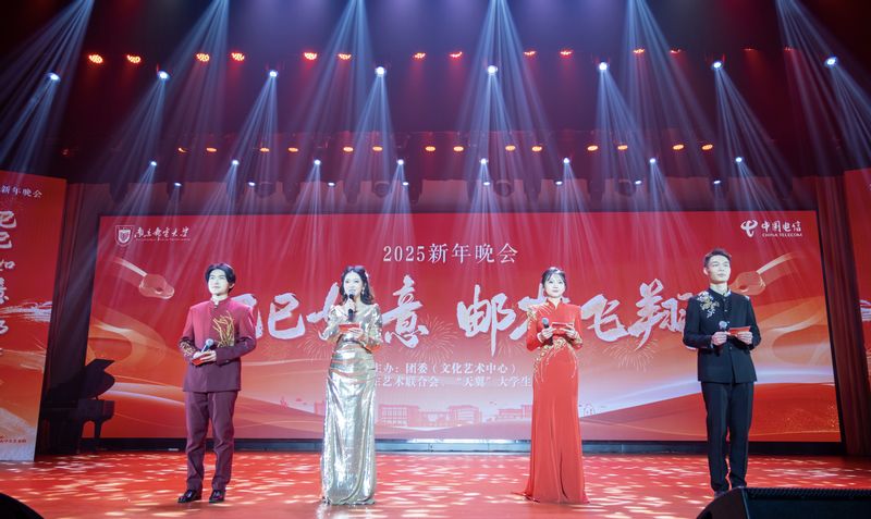 12月18日晚,南京郵電大學2025年“巳巳如意郵夢飛翔”主題新年晚會在仙林校區安恒青春劇場舉行。校黨委書記郭宇鋒,黨委副書記蔣國平,黨委常委、副校長姜小舜,省紀委監委派駐我校紀檢監察組組長、黨委常委、紀委書記、二級高級監察官周和林,黨委常委、副校長謝平,中國電信南京分公司黨委委員、副總經理、我校94級校友楊春澤,中國電信南京分公司校園營銷服務中心副總經理楊茜,部分校友代表、學校相關職能部門負責人、分管學生工作副書記和師生代表歡聚一堂,共享美好時光。