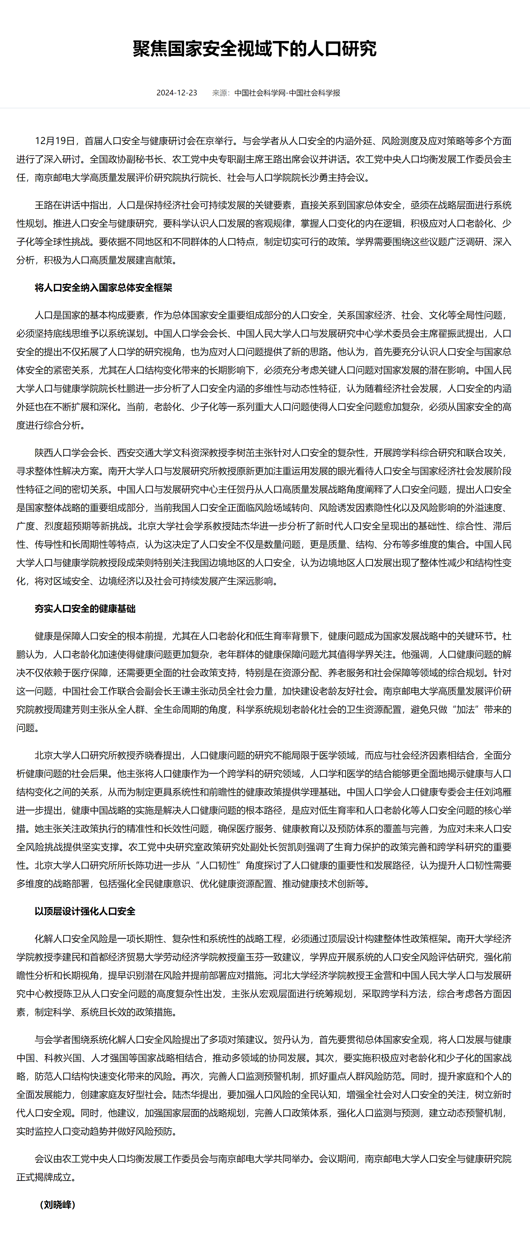 【中國社會科學網】聚焦國家安全視域下的人口研究