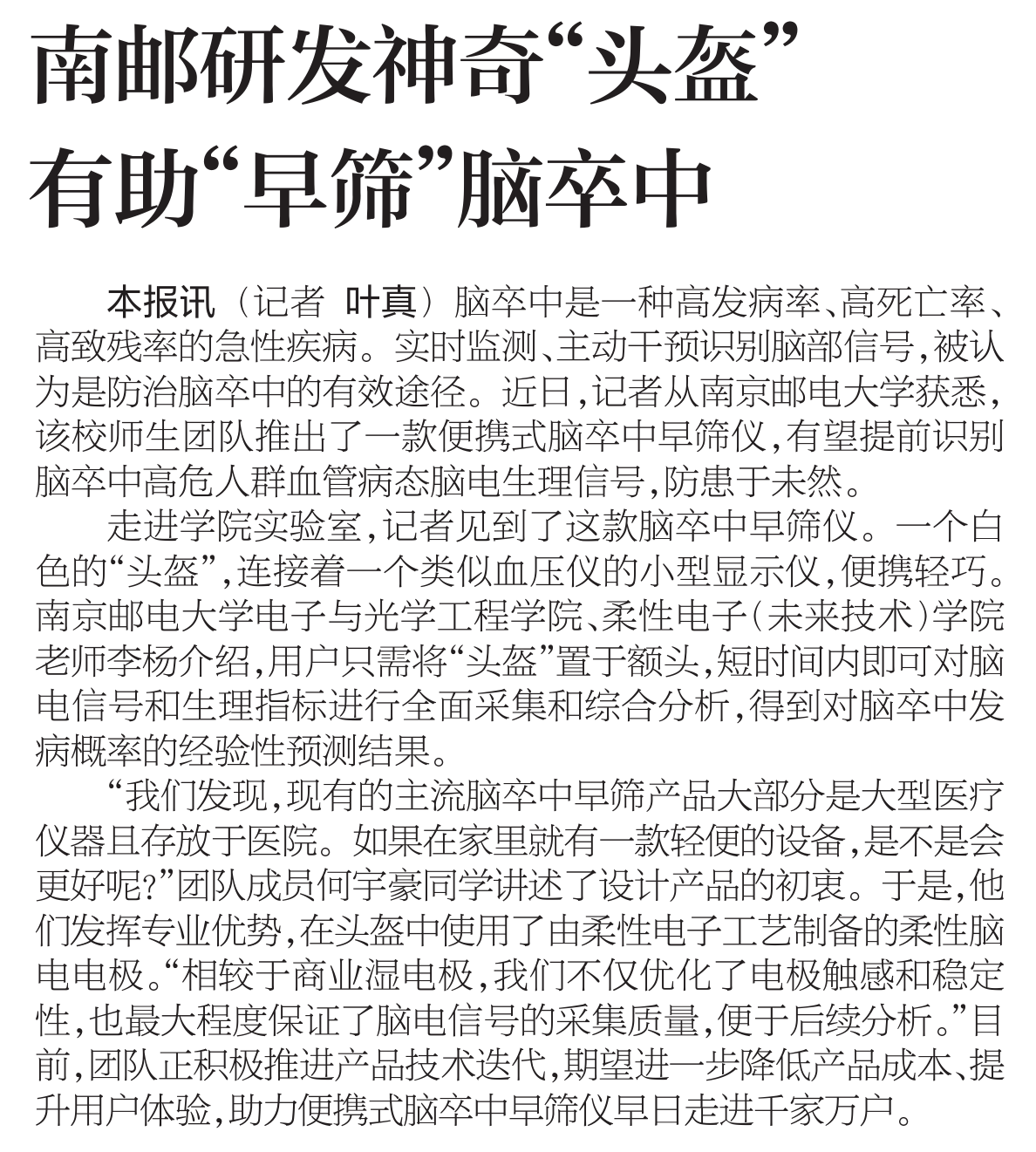 【新華日報】南郵研發神奇“頭盔”有助“早篩”腦卒中