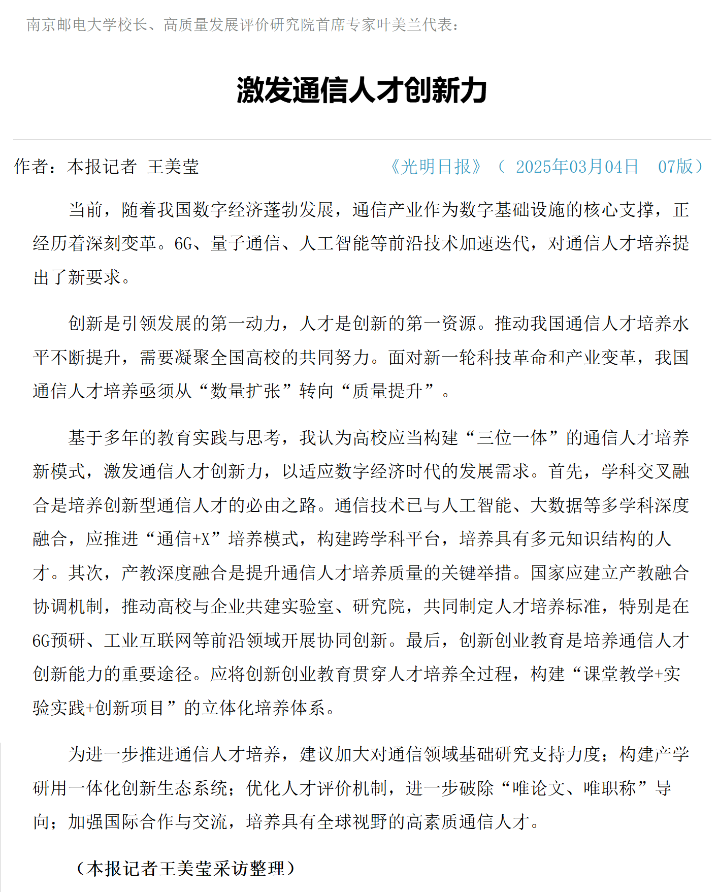 【光明日報】南京郵電大學校長、高質量發展評價研究院首席專家葉美蘭代表:激發通信人才創新力