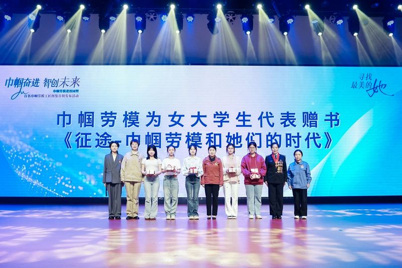 何光華等五位巾幗勞模為我校女大學生代表贈送書籍《征途——巾幗勞模和她們的時代》。
