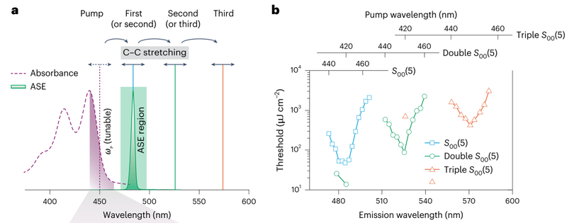 有機半導體因其獨特的分子結構和光電特性,被視為下一代柔性電子技術的核心材料,在柔性顯示、柔性光伏等領域廣泛應用。然而,其非線性光學效應需依賴極高能量激發,導致材料易被強光損傷,長期制約其在非線性光學領域的應用。拉曼散射是一種基于分子振動產生光學增益的非線性光學技術,因其特有的分子振動特征信號和靈活的光譜可調諧性,在爆炸物檢測、生物成像、光通訊等領域具有重要應用。傳統拉曼激射技術依賴高能量泵浦光源以克服分子振動損耗,導致設備繁雜、成本高昂。如何實現“低閾值、高增益”的拉曼激射,一直是全球科學家面臨的難題。