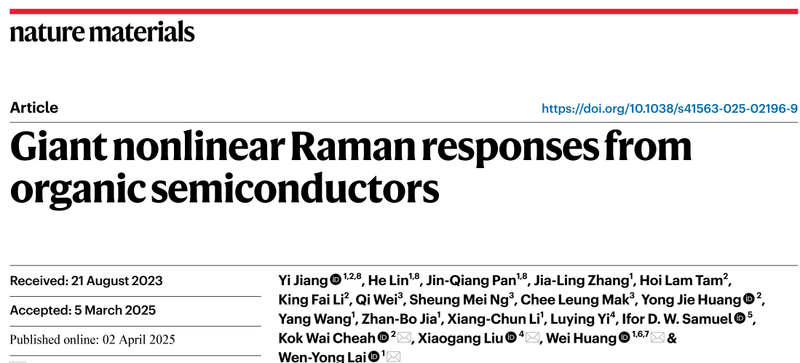 近日,柔性電子全國重點實驗室/化學與生命科學學院黃維院士、賴文勇教授團隊聯合香港浸會大學、新加坡國立大學等國際科研機構,在有機半導體非線性光學研究領域取得里程碑式進展。團隊創新提出“光譜調諧增益誘導拉曼激射”理論模型,揭示了分子振動與受激輻射共振匹配的核心機制,首次成功在有機半導體材料中實現拉曼信號的指數級放大和高效多階拉曼激射,而且無需依賴復雜的光學微腔結構。該研究突破了傳統非線性光學理論中“分子振動增益弱、依賴高能量泵浦”的瓶頸,為拓展有機半導體在拉曼激光等非線性光學領域的應用奠定了理論基礎,更為發展柔性拉曼激光器、實現高精度傳感檢測等提供新思路新方法。相關研究以“Giant nonlinear Raman responses from organic semiconductors”為題發表于國際頂級期刊《自然·材料》(Nature Materials, 2025, DOI: 10.1038/s41563-025-02196-9)。
