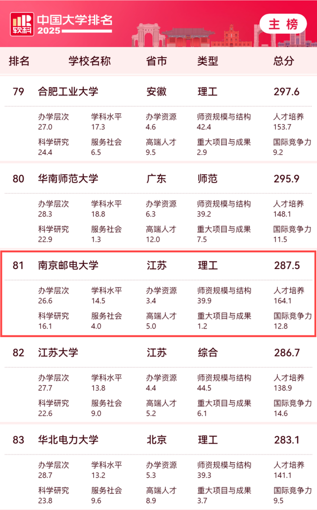 4月15日,高等教育專業(yè)評價機(jī)構(gòu)軟科發(fā)布“2025軟科中國大學(xué)排名”,南京郵電大學(xué)位列主榜全國第81名,實現(xiàn)“十四五”期間持續(xù)進(jìn)步,較2024年前進(jìn)4名。在2025軟科中國理工類大學(xué)排名位列全國第34名。