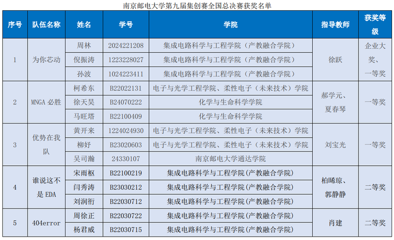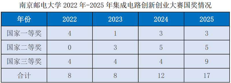 8月24日,第九屆全國大學(xué)生集成電路創(chuàng)新創(chuàng)業(yè)大賽總決賽在上海落下帷幕。南京郵電大學(xué)學(xué)生獲國家一等獎(jiǎng)3項(xiàng)(其中企業(yè)大獎(jiǎng)1項(xiàng))、國家二等獎(jiǎng)5項(xiàng)、國家三等獎(jiǎng)9項(xiàng)。國家級(jí)一等獎(jiǎng)數(shù)量列全國參賽高校第五名、江蘇參賽高校第一名。南郵獲“優(yōu)秀組織獎(jiǎng)”。