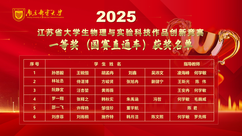 8月22-24日,第二十二屆江蘇省高校大學生物理與實驗科技作品創新競賽現場決賽在南京舉行。經過作品展示和答辯評比,南京郵電大學獲一等獎6項(均晉級全國決賽)、二等獎14項、三等獎8項,獲獎率達87.5%。南郵獲“優秀組織獎”。
