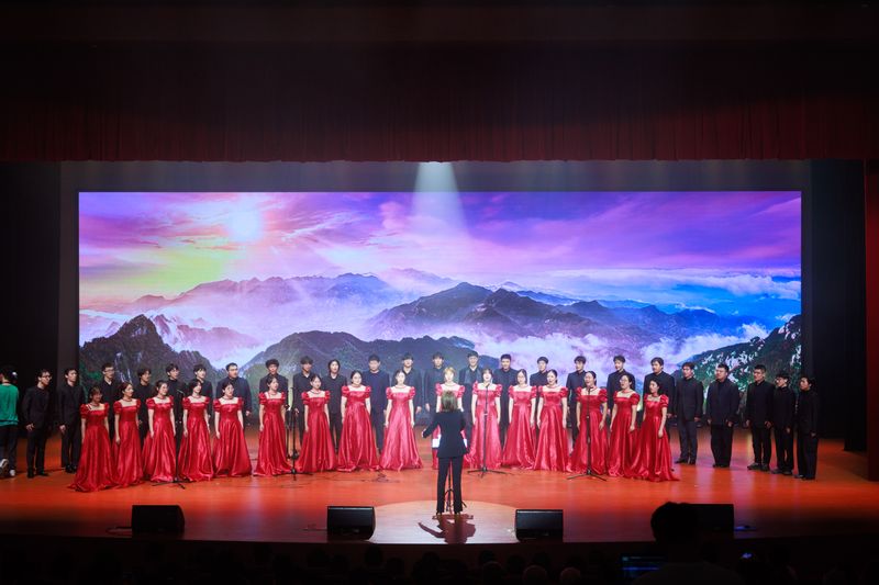 展演在雄壯的交響管樂《在太行山上》中拉開帷幕,在原南京軍區(qū)軍樂隊隊長章夏騫的指揮下,雨花石交響管樂團用豪邁的演奏跨越時空傳遞團結(jié)、奮斗的正能量。著名軍旅歌唱家項緒文激情獻唱《強軍戰(zhàn)歌》,生動展現(xiàn)了人民軍隊聽黨指揮、能打勝仗、作風(fēng)優(yōu)良的堅定信念。由著名電視文獻片編導(dǎo)吳建寧創(chuàng)作、江蘇省朗誦協(xié)會副會長兼秘書長傅國朗誦的《嵌入大地的英名》深情訴說了江蘇這片紅色熱土上的英烈故事。軍旅歌唱家李越勝、蔣菁演唱的經(jīng)典二重唱《九九艷陽天》再現(xiàn)了戰(zhàn)火中的軍民魚水深情。抗戰(zhàn)歌曲《長城謠》《游擊隊之歌》《天下鄉(xiāng)親》《打個勝仗笑哈哈》《新四軍軍歌》等經(jīng)典旋律次第響起,項緒文、李越勝、孫穎、袁良梓四人用激昂的歌聲將觀眾帶回到那段烽火連天的歲月。國家一級演員、著名京劇表演藝術(shù)家汪明演唱的現(xiàn)代京劇《沙家浜》選段《祖國的好山河寸土不讓》,韻味悠長,氣壯山河。由著名詩人吳國平專門為本次展演創(chuàng)作,軍旅表演藝術(shù)家王安麗、崔根栓、馬艷、郝率共同演繹的詩朗誦《強大》,鏗鏘有力地展現(xiàn)了中國日益增強的軍事實力與民族自信。原前線文工團團長、著名二胡演奏家楊積強等人帶來的胡琴聯(lián)奏組曲《難忘的旋律》及經(jīng)典名曲《戰(zhàn)馬奔騰》,以磅礴的氣勢展現(xiàn)了人民軍隊金戈鐵馬、馳騁疆場的豪邁氣概。在著名青年歌唱家王莉麗演唱的《我們的新時代》的歌聲里,現(xiàn)場師生被音樂中傳遞的希望與力量深深打動。
