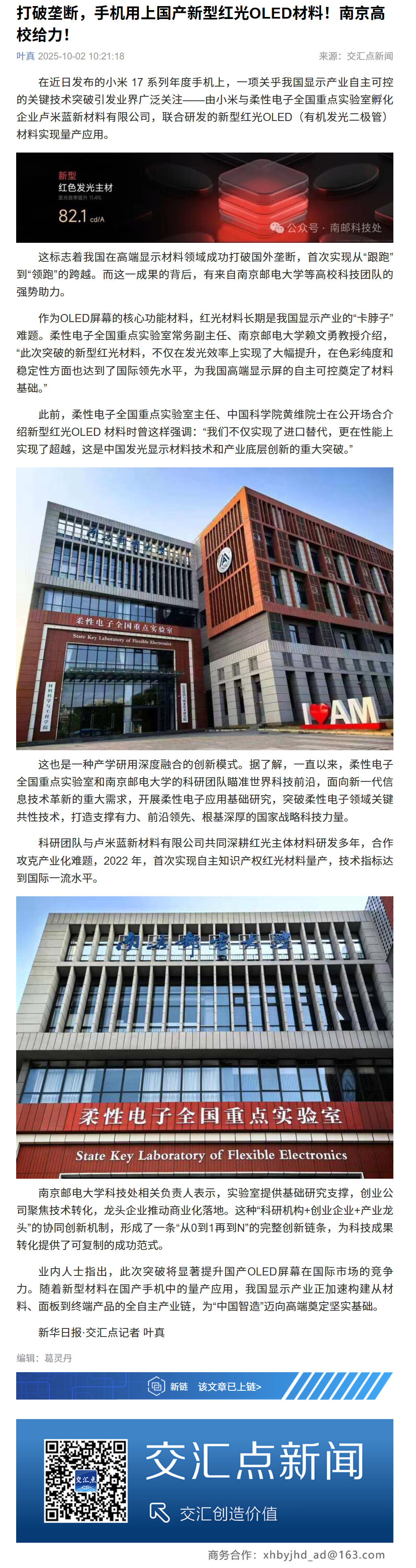 【新華日報客戶端】打破壟斷,手機用上國產(chǎn)新型紅光OLED材料!南京高校給力!