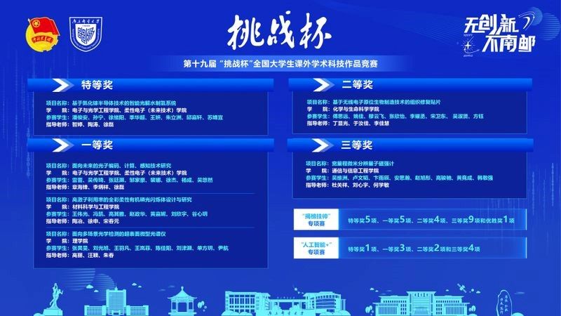 11月3日,第十九屆“挑戰杯”全國大學生課外學術科技作品競賽終審決賽在南京閉幕,南京郵電大學獲主體賽特等獎1項、一等獎3項、二等獎1項和三等獎1項;“揭榜掛帥”專項賽特等獎5項、一等獎5項、二等獎4項、三等獎9項和優勝獎1項;“人工智能+”專項賽特等獎1項、一等獎3項、二等獎2項和三等獎4項。南郵首次實現特等獎賽道全覆蓋,競賽總積分達到歷史最好成績,全國并列第十五、江蘇并列第二、省屬高校第一,再捧國賽“優勝杯”。