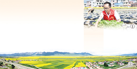 圖①:湖南江永縣紀委監委鄉村振興工作隊黨員干部在田間幫助農戶移栽春苗。田如瑞攝;圖②:青海門源回族自治縣油菜花盛開美景。姜峰攝