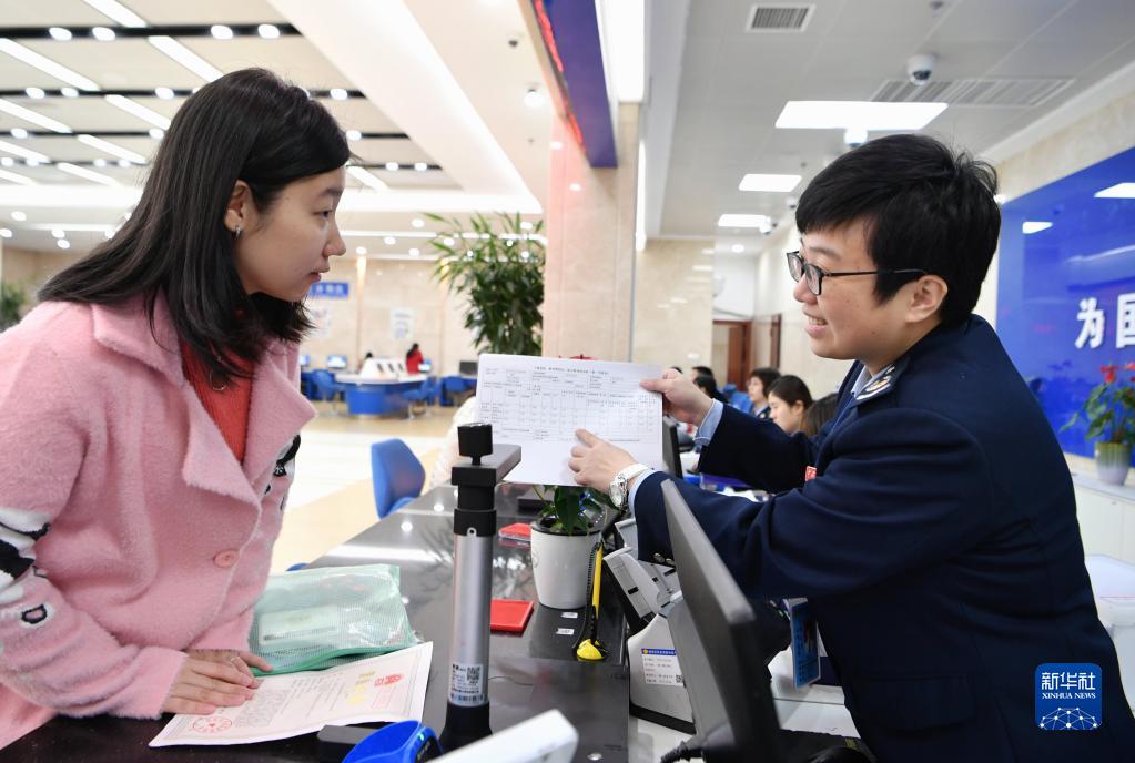 2020年1月21日,工作人員在國家稅務總局福州市鼓樓區稅務局辦稅服務大廳為企業財務人員介紹減稅申報表的填寫方法。