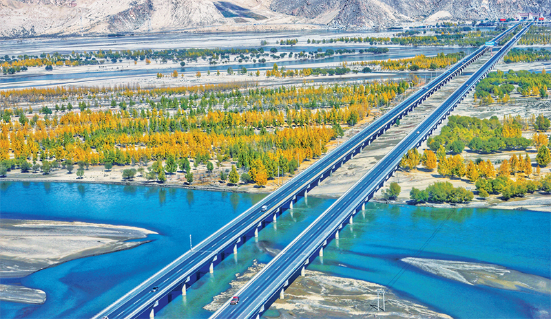 黨的十八大以來,我國連續十年實施積極的財政政策,加大對基礎設施建設投入力度。圖為跨越雅魯藏布江的拉貢機場高速路。 財政部供圖 劉永恒/攝