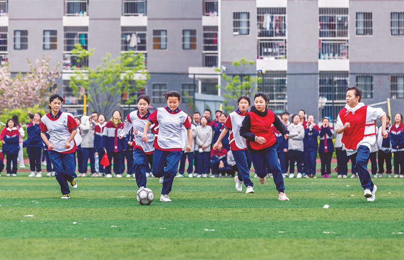 2022年積極的財政政策突出?;径档拙€,切實保障和改善民生。其中,包括支持建設高質量教育體系,優化教育支出結構,增加義務教育經費投入,促進義務教育優質均衡發展和城鄉教育一體化。圖為2022年3月29日,學生在貴州省黔西一中參加足球比賽?!∪嗣駡D片 范暉/攝