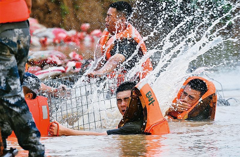 圖為2021年7月22日,在河南省開封市賈魯河小崗凹河段,空降兵某旅官兵跳入齊胸深的洪水中加固堤壩。