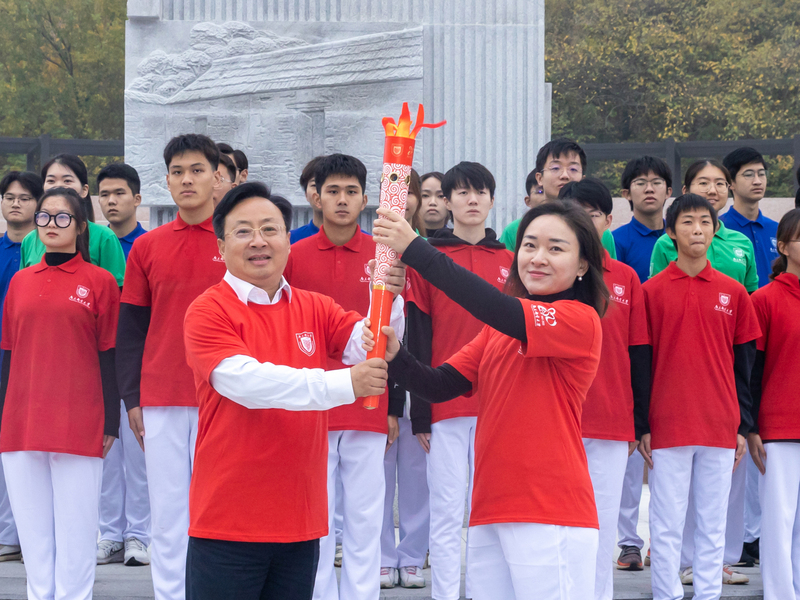黨委書記劉陳與教師代表進行火炬?zhèn)鬟f