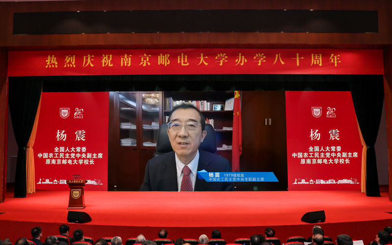 全國(guó)人大常委、農(nóng)工民主黨中央副主席、我校杰出校友楊震作為校友代表,通過視頻為母校獻(xiàn)上誠(chéng)摯祝福。他深情回憶了自己在南郵學(xué)習(xí)、工作和生活的40年,表達(dá)了對(duì)母校的感恩與思念之情,他表示今天的南郵昂首進(jìn)入國(guó)家雙一流行列,已經(jīng)成為國(guó)家在信息通信領(lǐng)域人才培養(yǎng)的搖籃,科技創(chuàng)新的重鎮(zhèn),社會(huì)服務(wù)的高地,文化傳播的圣地,全體南郵人為母校感到自豪。他指出當(dāng)今的信息社會(huì)給南郵和南郵人的發(fā)展提供了十分廣闊的舞臺(tái),他希望南郵培養(yǎng)出世界一流人才,創(chuàng)造出世界一流科技成果。