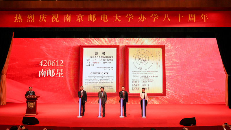 大會(huì)上,中國(guó)科學(xué)院院士史生才先生、省教育廳副廳長(zhǎng)楊樹兵先生、中國(guó)科學(xué)院南京分院院長(zhǎng)楊桂山先生和我校葉美蘭校長(zhǎng)共同為“南郵星”揭幕。“南郵星”是南京郵電大學(xué)在辦學(xué)80周年之際,收到的一份來自太空的特殊禮物,它是由南京紫金山天文臺(tái)發(fā)現(xiàn)的一顆永久編號(hào)為420612的小行星。紫金山天文臺(tái)副臺(tái)長(zhǎng)吳雪峰表示,南京郵電大學(xué)為國(guó)家培育了一大批郵電通訊等領(lǐng)域的人才,被譽(yù)為“華夏IT英才的搖籃”,值此八十華誕之際,以一顆小行星為之譽(yù)名,體現(xiàn)了國(guó)際社會(huì)對(duì)南京郵電大學(xué)治學(xué)成就的高度褒揚(yáng)。