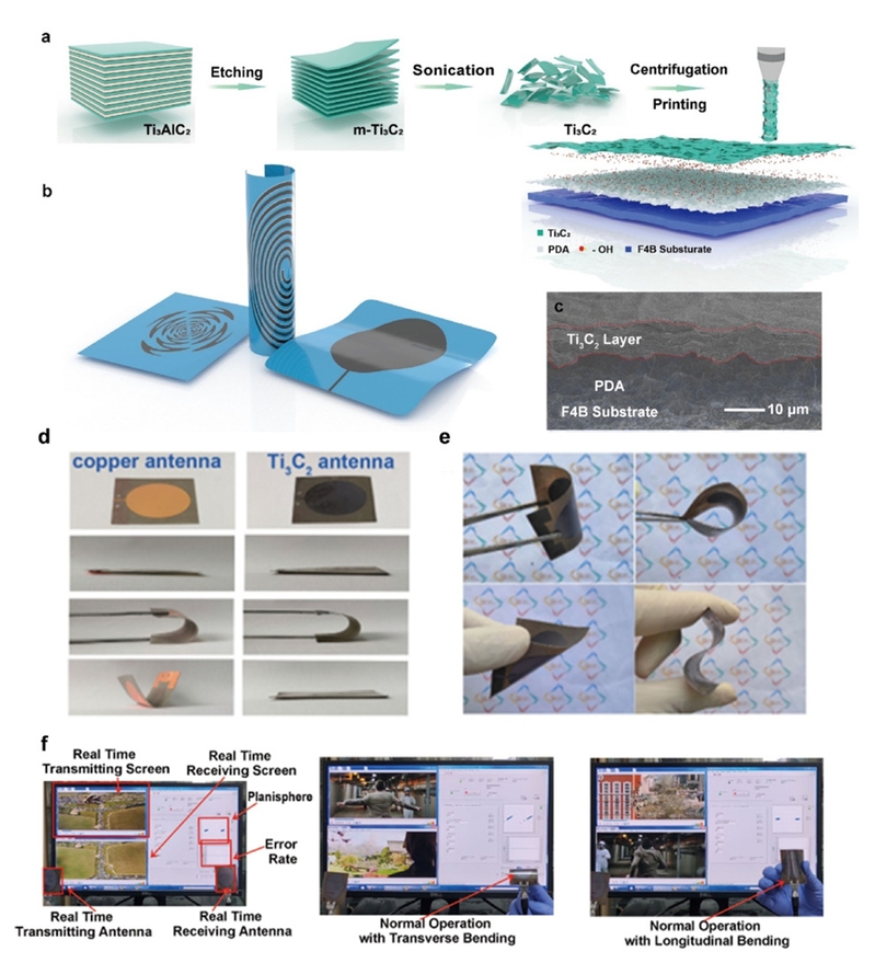 近日,南京郵電大學有機電子與信息顯示國家重點實驗室黃維院士、趙強教授團隊和射頻集成與微組裝技術國家地方聯合工程實驗室劉蕾蕾教授團隊在柔性射頻天線領域取得重要進展,優化了“分子膠水”界面改性工藝和先進擠壓印刷技術相結合的策略,構建了柔性超寬帶Ti3C2單極子天線,實現了在彎曲狀態下流暢實時的無線通信傳輸。1月17日,相關成果以“2D Titanium carbide printed flexible ultra-wideband monopole antenna for wireless communications”為題發表在國際學術期刊Nature Communications(《自然?通訊》)上。南京郵電大學為論文的唯一通訊單位,劉蕾蕾教授、趙強教授和黃維院士為共同通訊作者,趙為為副教授和倪浩博士為共同第一作者。這是我校材料、電子、通信三個優勢學科團隊共同合作在“柔性電子”交叉學科領域取得的重要研究成果。