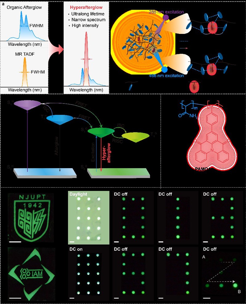 近日,南京郵電大學有機電子與信息顯示國家重點實驗室黃維院士、陳潤鋒教授和陶冶教授團隊在有機超余輝領(lǐng)域取得新進展,提出一種簡單而有效的主體敏化和穩(wěn)定孤立發(fā)色團策略,研制出兼具長壽命、高效率以及高色純度的超余輝聚合物,探索了該類材料在高分辨余輝顯示領(lǐng)域的潛在應(yīng)用。1月30日,相關(guān)成果以“Multicolor hyperafterglow from isolated fluorescence chromophores”為題發(fā)表在國際學術(shù)期刊Nature Communications(《自然?通訊》)上。材料科學與工程學院陶冶教授、陳潤鋒教授和黃維院士為共同通訊作者,碩士生張孝為論文第一作者。