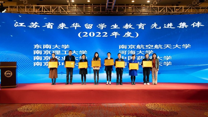 我校榮獲2022年度“江蘇省來華留學生教育先進集體”榮譽稱號(右三)