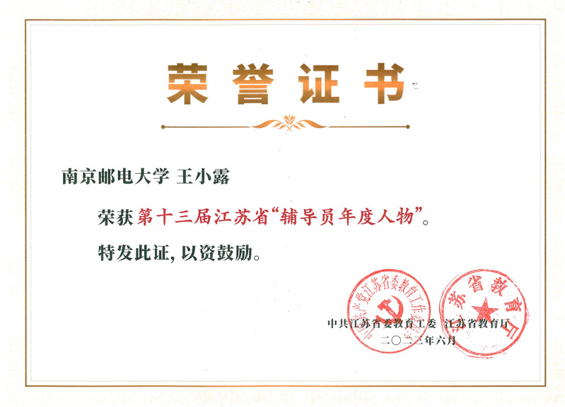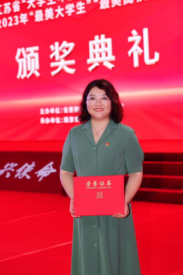 6月18日,由省委教育工委、省教育廳主辦的第十三屆江蘇省“大學生年度人物和高校輔導員年度人物”暨2023年“最美大學生”“最美高校輔導員”頒獎典禮舉行。我校計算機學院、軟件學院、網絡空間安全學院黨委副書記、副院長王小露榮獲第十三屆“江蘇省高校輔導員年度人物”榮譽稱號。