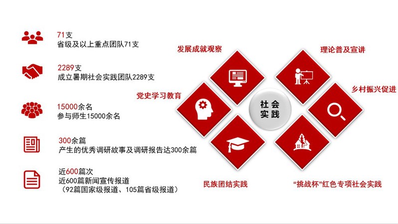 為深入學(xué)習(xí)貫徹習(xí)近平新時(shí)代中國(guó)特色社會(huì)主義思想和黨的二十大精神,認(rèn)真落實(shí)習(xí)近平總書記關(guān)于青年工作的重要思想,今年暑假,學(xué)校組織開展了以“學(xué)習(xí)二十大 永遠(yuǎn)跟黨走 奮進(jìn)新征程”為主題的大學(xué)生暑期“三下鄉(xiāng)”社會(huì)實(shí)踐活動(dòng)。以上好“一堂最大的國(guó)情社情思政課”和“一堂最大的專業(yè)教育實(shí)踐課”為目標(biāo),共計(jì)組建2289支實(shí)踐團(tuán)隊(duì),其中獲批省級(jí)及以上重點(diǎn)團(tuán)隊(duì)71支。15000余名師生以理論普及宣講、黨史學(xué)習(xí)教育、鄉(xiāng)村振興促進(jìn)、發(fā)展成就觀察、“挑戰(zhàn)杯”紅色專項(xiàng)和愛校榮校等為主線,厚植愛國(guó)情、砥礪強(qiáng)國(guó)志、付諸報(bào)國(guó)行。相關(guān)社會(huì)實(shí)踐成果被《光明日?qǐng)?bào)》《中國(guó)青年報(bào)》、人民網(wǎng)、中國(guó)青年網(wǎng)、新華網(wǎng)、央廣網(wǎng)等各級(jí)媒體宣傳報(bào)道近600篇。
