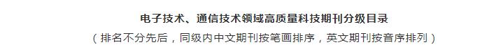 12月21日,《南京郵電大學(xué)學(xué)報(bào)(自然科學(xué)版)》入編電子技術(shù)、通信技術(shù)領(lǐng)域高質(zhì)量科技期刊分級目錄,位列T2級。中國電子學(xué)會(huì)公布的電子技術(shù)、通信技術(shù)領(lǐng)域高質(zhì)量科技期刊分級目錄,232種期刊進(jìn)入該目錄,其中T1級期刊48種(中文期刊4種、英文期刊44種),T2級期刊92種(中文期刊16種、英文期刊76種),T3級期刊92種(中文期刊28種、英文期刊64種)。