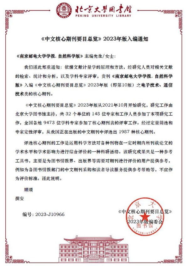 12月26日,《南京郵電大學(xué)學(xué)報(bào)(自然科學(xué)版)》入編《中文核心期刊要目總覽》2023年版(第10版)“電子技術(shù)、通信技術(shù)”類的核心期刊。這是繼1992年版(第1版)、2011年版(第6版)、2014年版(第7版)、2017年版(第8版)和2020年版(第9版)后第六次入編《中文核心期刊要目總覽》。《中文核心期刊要目總覽》2023年版(第10版)依據(jù)文獻(xiàn)計(jì)量學(xué)的原理和方法,經(jīng)研究人員對相關(guān)文獻(xiàn)檢索、統(tǒng)計(jì)和分析,學(xué)科專家評審,從我國正在出版的中文期刊中評選出1987種核心期刊。