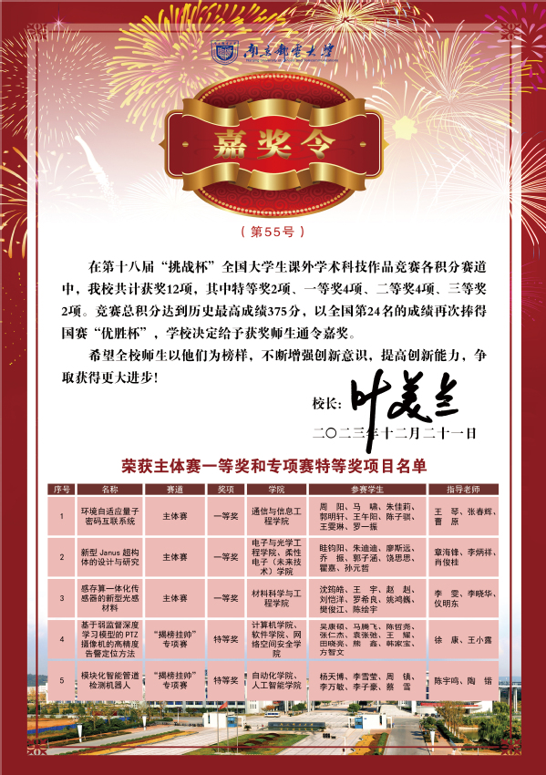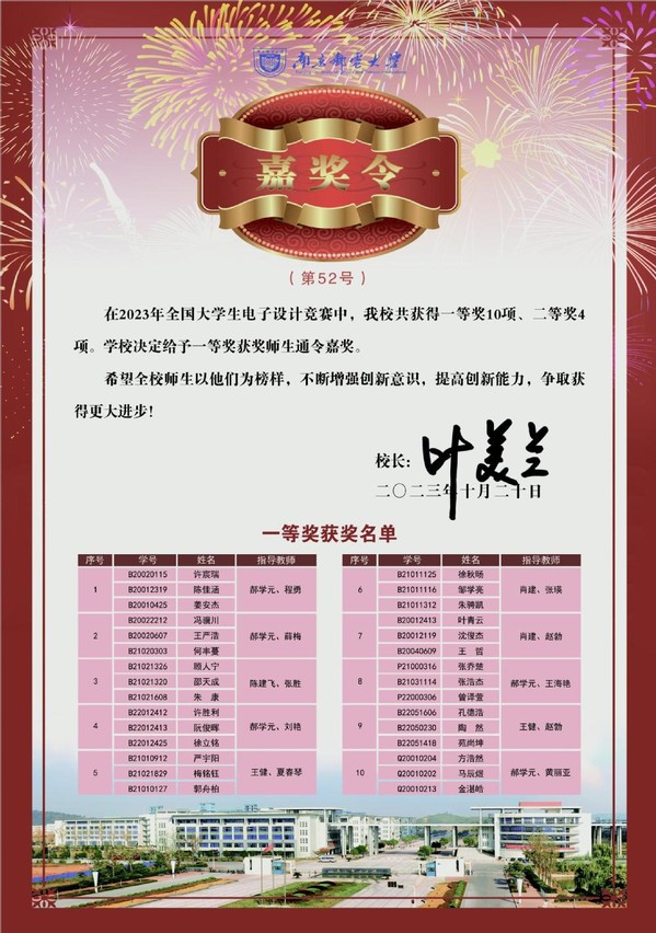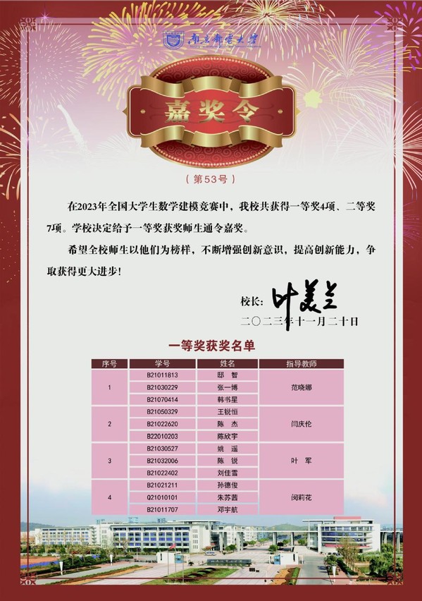 近日,葉美蘭校長簽發嘉獎令,表彰我校在中國國際大學生創新大賽(2023)、第十八屆“挑戰杯”全國大學生課外學術科技作品競賽、2023年全國大學生電子設計競賽、2023年全國大學生數學建模競賽等重要學科競賽中取得佳績的師生,希望全校師生以他們為榜樣,不斷增強創新意識,提高創新能力,爭取獲得更大進步!