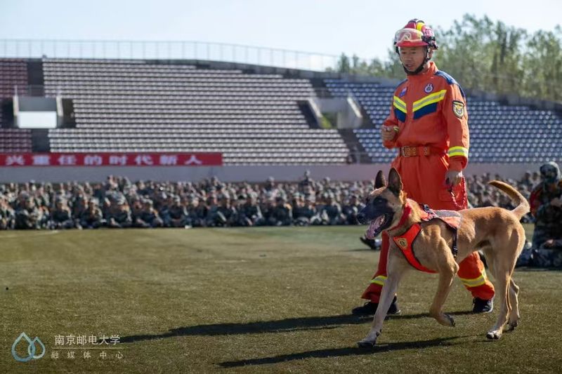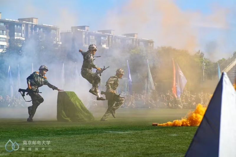 分列式方隊步履鏗鏘地依次通過主席臺,他們昂首挺胸、神采飛揚,以洪亮的口號、整齊的揮臂、堅定的腳步、昂揚的姿態展現了南郵學子熱情飽滿的精神風貌。好男兒勢不可擋,女兒郎巾幗風采,紅旗方陣整齊劃一,軍體拳表演虎虎生威,匕首操表演氣勢如虹,戰術演練、消防及應急救護訓練有素,現場掌聲雷動。
