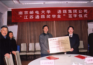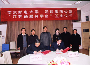 12月7日下午,江蘇通鼎集團公司在南京郵電大學設立“江蘇通鼎獎學金”協議書簽字儀式在我校舉行。校黨委書記、 校長謝玲和通鼎集團公司董事長沈小平分別代表雙方在協議上簽字,副校長唐金土向通鼎集團公司贈送了設獎紀念銅牌,簽 字儀式由校辦主任周南平主持,校相關部門負責人出席了簽字儀式。 根據協議,通鼎集團公司在南京郵電大學設立總額為50萬元人民幣的“江蘇通鼎獎學金”,分五年(2005年—2009 年)每年10萬元用于獎勵品學兼優的全日制在校本科生、研究生。南京郵電大學可組織獲獎學生赴通鼎集團公司參加科學研究 或其它形式的社會實踐活動,根據通鼎集團公司的需要,學校為公司提供員工或客戶培訓,開展相關技術合作。 (校長辦公室)